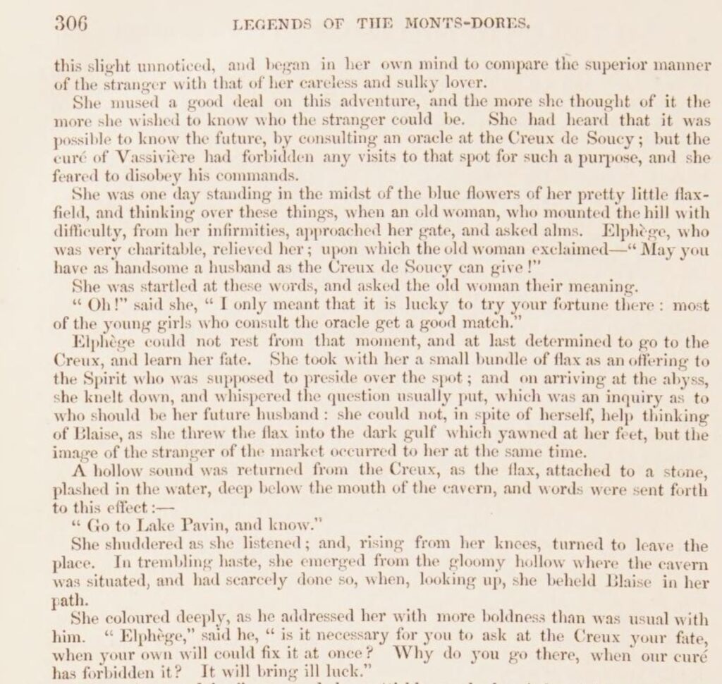 Costello, author of the two-volume A Pilgrimage to Auvergne (1842) spent several months in Auvergne in 1841 and picked up many a ghost story and anecdote during her stay. Her ghost tale, which — to be clear — is entirely her own creation, was nevertheless likely influenced by some local traditions. In Costello’s time, Lake Pavin had even more of a haunted reputation than it does now. People were more than aware of the lake’s treacherous depths, and many had probably seen or heard about its waterspouts and seiches (standing waves). Surely, all of this suggested to them that something strange — or even infernal — was at work below the surface. Pavin, they must have thought, was haunted by a Spirit, and this Spirit, like the old-world monsters of myth, preyed upon mortals who strayed too far into its domain. This is precisely what unfolds in Costello’s cautionary tale: