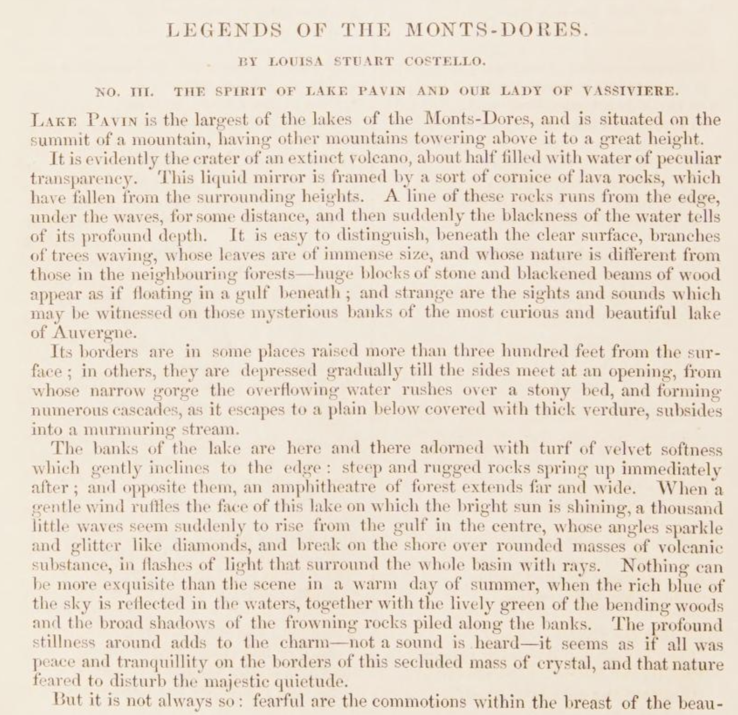 Since its founding in 2023, Visit Auvergne has constantly tried to revisit lost or under-studied regional histories by bringing back to the fore old books and sources that have fallen by the wayside. And so it’s in this spirit that I present “The Spirit of Lake Pavin And Our Lady of Vassivière”, a short story written almost two centuries ago by the British writer Louisa Stuart Costello.