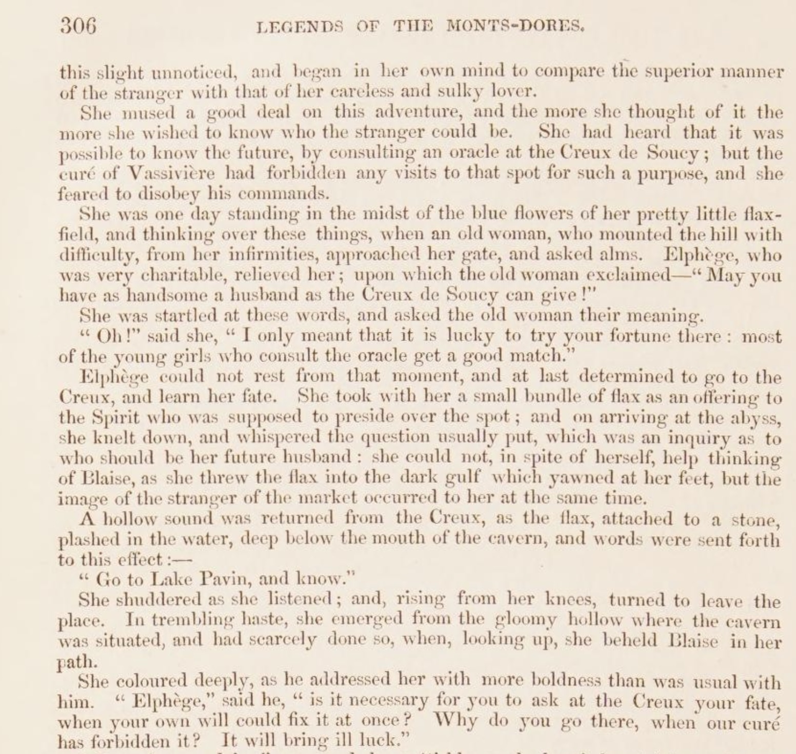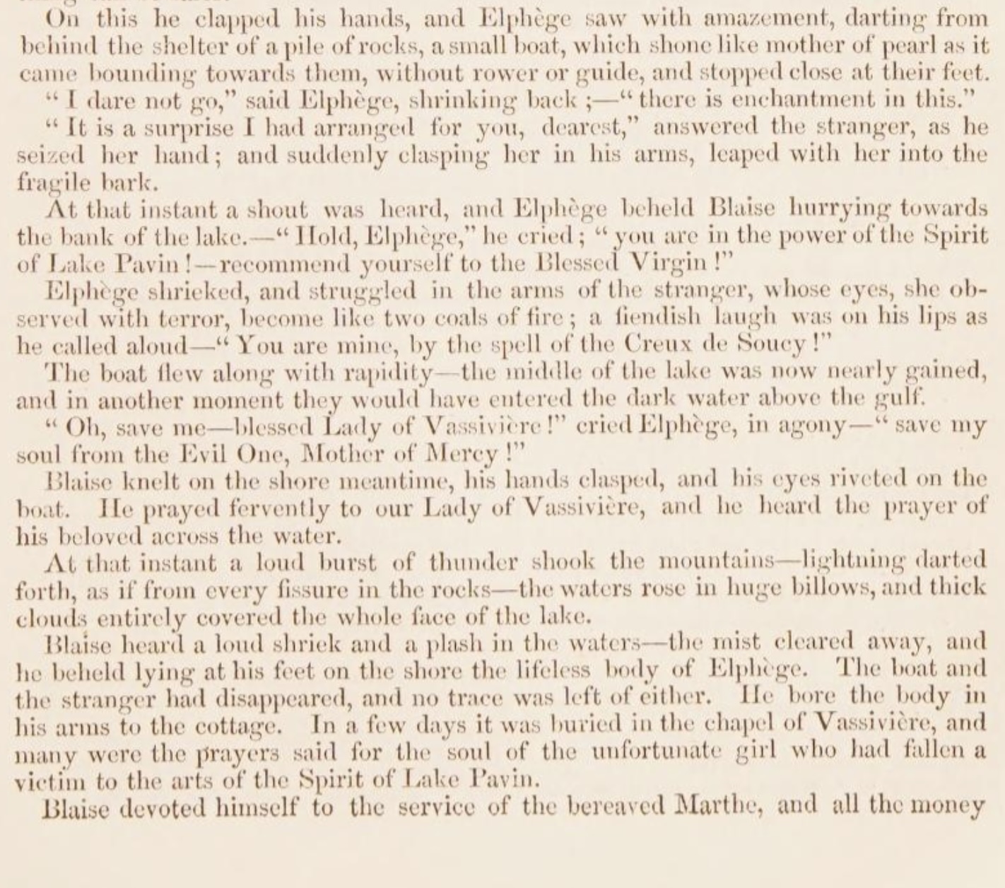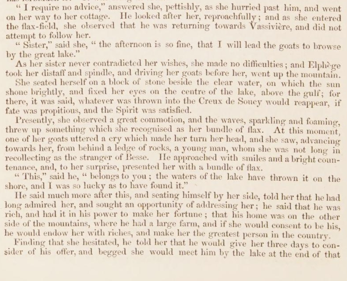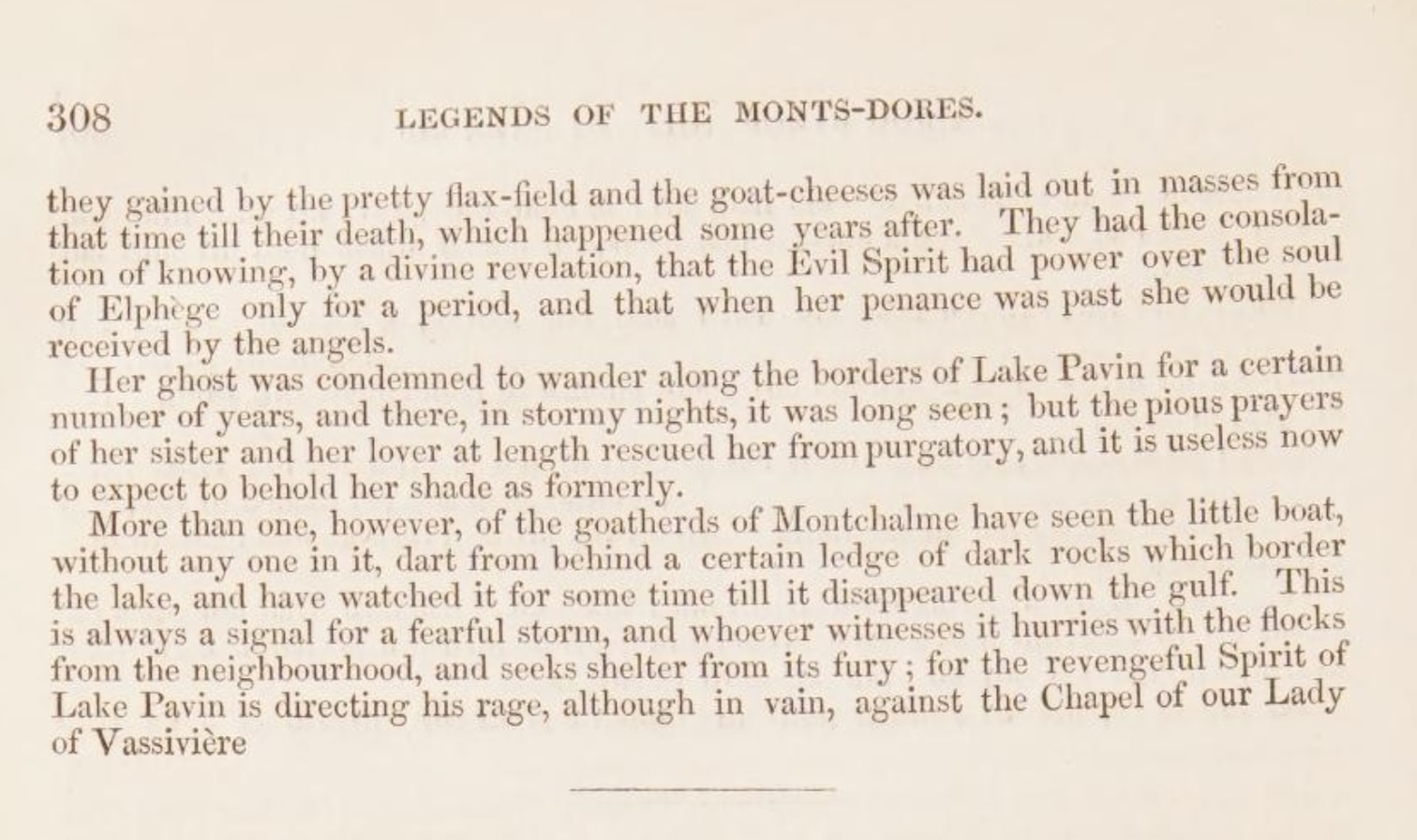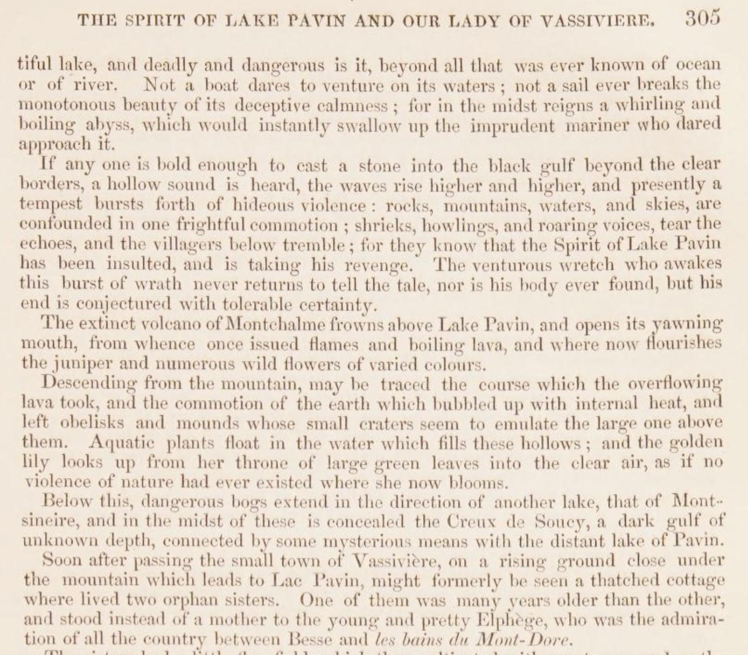 Costello, author of the two-volume A Pilgrimage to Auvergne (1842) spent several months in Auvergne in 1841 and picked up many a ghost story and anecdote during her stay. Her ghost tale, which — to be clear — is entirely her own creation, was nevertheless likely influenced by some local traditions. In Costello’s time, Lake Pavin had even more of a haunted reputation than it does now. People were more than aware of the lake’s treacherous depths, and many had probably seen or heard about its waterspouts and seiches (standing waves). Surely, all of this suggested to them that something strange — or even infernal — was at work below the surface. Pavin, they must have thought, was haunted by a Spirit, and this Spirit, like the old-world monsters of myth, preyed upon mortals who strayed too far into its domain. This is precisely what unfolds in Costello’s cautionary tale: